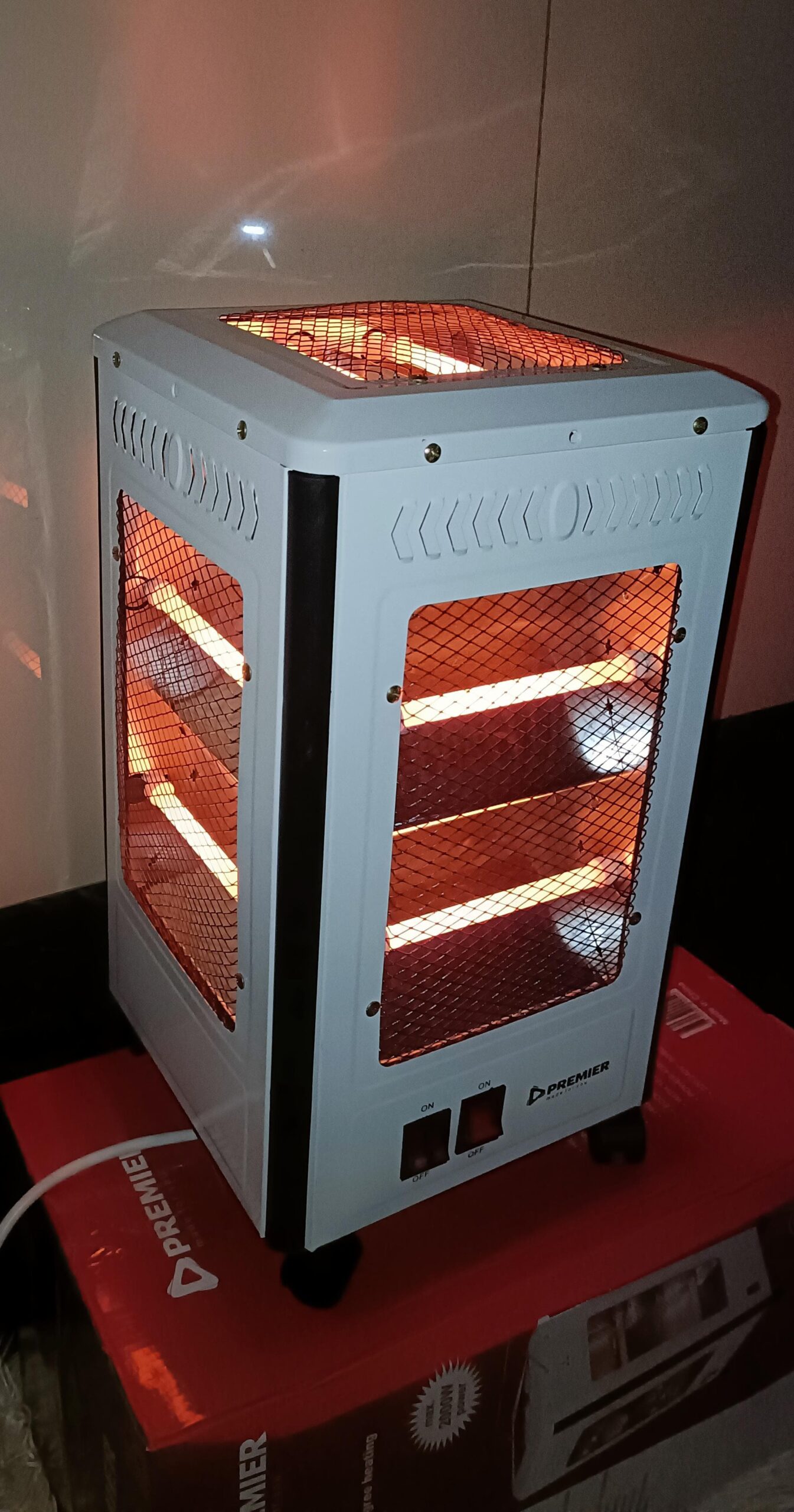 Keep your home warm during this cold season with this tiny portable heater. This Quartz Heater produce Cool, warm and hot winds. It comes with Adjustable thermostat with Thermal automatic cut-out when it gets to the right temperature, which prevents overheating. This model is also designed with energy efficiency in mind. It uses either of power to heat up the environment. There are two heat setting selections included.